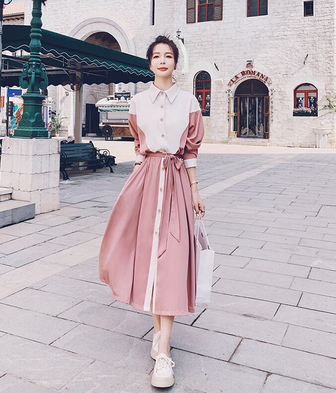 ワンピース シャツ ブラウス フレアスカート シャツワンピース 膝丈 ひざ丈 ミモレ ミモレ丈 袖あり 長袖 襟付き フレア セミフレア ハイウエスト 前開き かわいい 大人可愛い きれいめ シンプル 大人 上品 おしゃれ お洒落 ラブリー キュート ガーリー 無地 春 二次会 披露宴 10代 20代 30代 レディース 女性用 OL 通勤 学生 通学 デート お出かけ お泊まり 休日 パーティー レストラン ショッピング 韓国 オルチャン トレンド 流行 サイズ S M L XL 色展開 ピンク