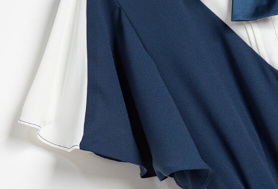 ネイビーとホワイトのクリーンな印象のバイカラーに、鍵盤柄のスカーフが可愛い主役級の一着となっています。