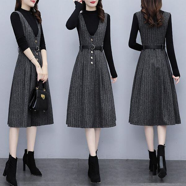 ストライプとボタンのデザインがオシャレなジャンパースカートです。