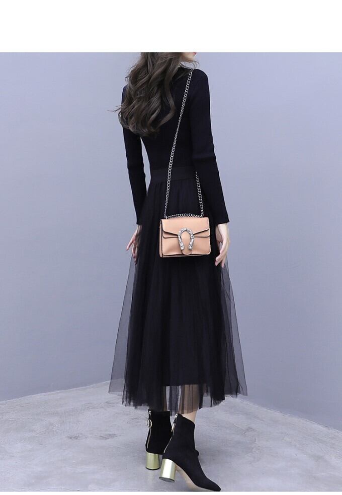 ワンピース チュールスカート ワンピドレス 膝下 ミモレ ミモレ丈 長袖 Uネック スリム タイト 細身 ペプラム 切り替えデザイン チュール 伸縮性 ドッキング かわいい 大人可愛い きれいめ シンプル 大人 上品 おしゃれ お洒落 大人女子 こなれ感 ガーリー モード系 エレガント モダン S M L XL 黒 ブラック 大人カラー 無地 春 秋 レディース OL 通勤 デート お出かけ パーティー イベント 着回し 普段使い 重ね着 韓国 韓国系 オルチャン コーデ スタイル 楽ちん モテ 定番