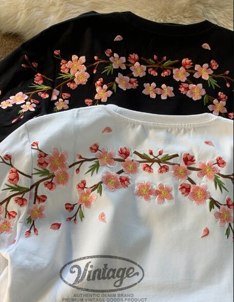 サクラをモチーフにした刺繍がフロントとバックに入った、和モダンな印象のビッグTシャツです。