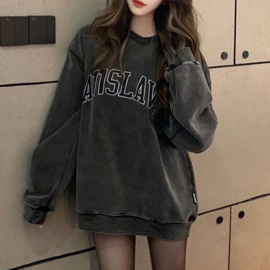 トップス スウェット オーバーサイズ ウォッシュド プルオーバー ラグランスリーブ ルーズ 冬 プリント ラウンドネック 長袖 レギュラー丈 綿 ダークグレー M L XL 2XL 3XL 袖あり ボリューム袖 襟なし ワイド かわいい 大人可愛い カジュアル 大人 おしゃれ お洒落 かっこいい レトロ 大人女子 こなれ感 ラフ マニッシュ キュート 10代 20代 レディース 女性用 オフィス OL 学生 通学 お出かけ 休日 アウトドア 着回し 普段使い ファッション コーデ 楽ちん モテ 大きめ
