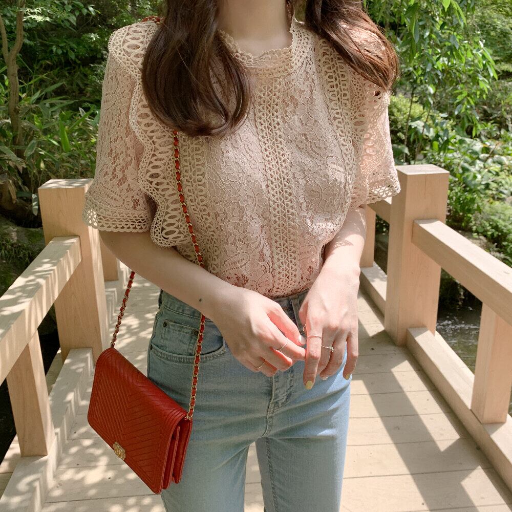 トップス シャツ ミディアム丈 ミドル丈 袖あり 半袖 ラウンドネック レース 透け感 薄手 可愛い かわいい きれいめ シンプル カジュアル 大人 上品 おしゃれ お洒落 レトロ 大人可愛い 大人女子 こなれ感 ラフ ラブリー キュート ガーリー 無地 春 夏 10代 20代 レディース 女性用 学生 通学 デート お出かけ 公園 女子会 休日 買い物 ショッピング 着回し 普段使い 韓国 オルチャン ファッション コーデ スタイル モテ サイズ展開 S M L XL ベージュ アプリコット 春カラー
