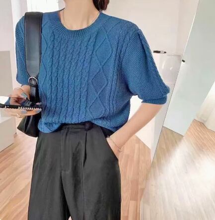 半袖デザインのケーブルニットです。カジュアルにもエレガントでも合わせる事ができるデイリー使いに便利なアイテムです。