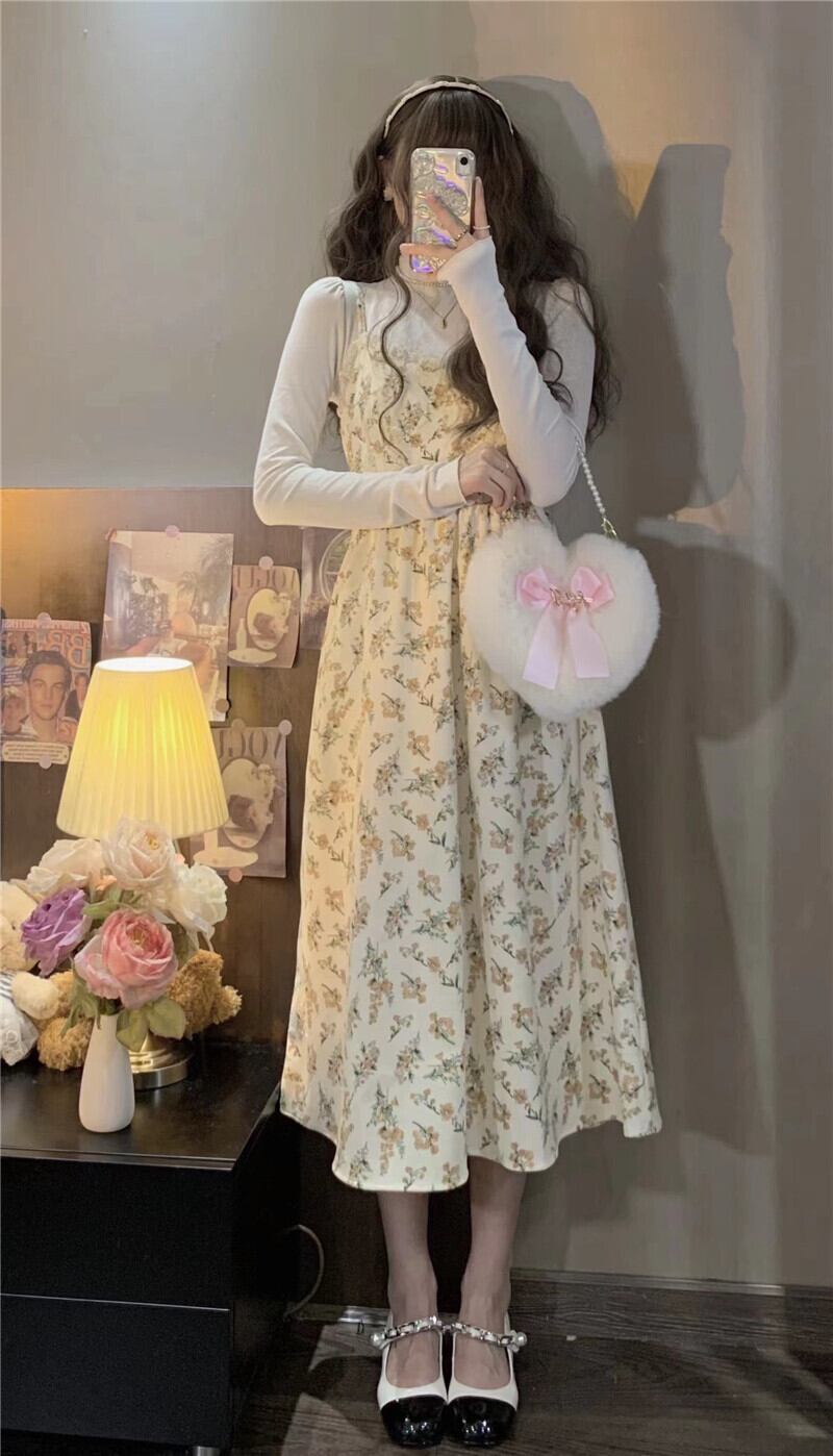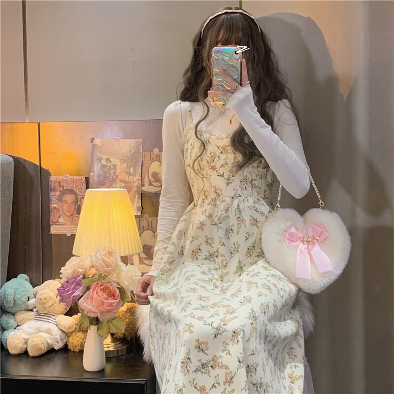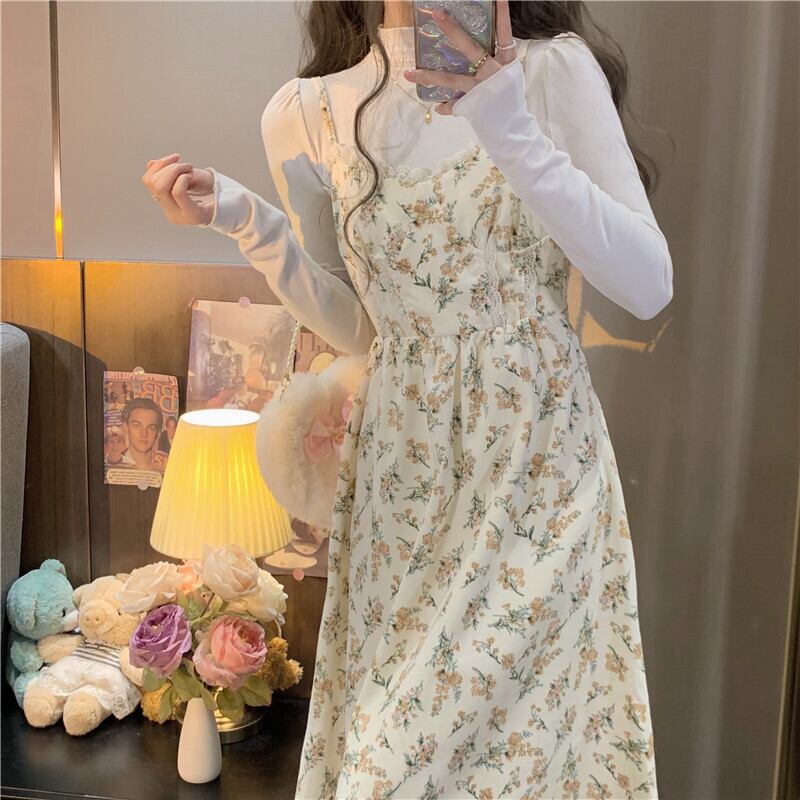 2点セット ツーピース セットアップ ワンピース カットソー キャミソールワンピース プルオーバー ロングスカート ノースリーブ ラウンドネック 春 プリント 通勤 フラワー アプリコット ピンク S M L フリーサイズ ハイウエスト サスペンダー レトロ 冬 トップス シャツ ロング 上下セット かわいい 大人可愛い 大人 おしゃれ お洒落 大人女子 ラブリー キュート ガーリー モダン 花柄 10代 20代 レディース 女性用 オフィス OL 学生 デート 旅行 ファッション コーデ スタイル モテ