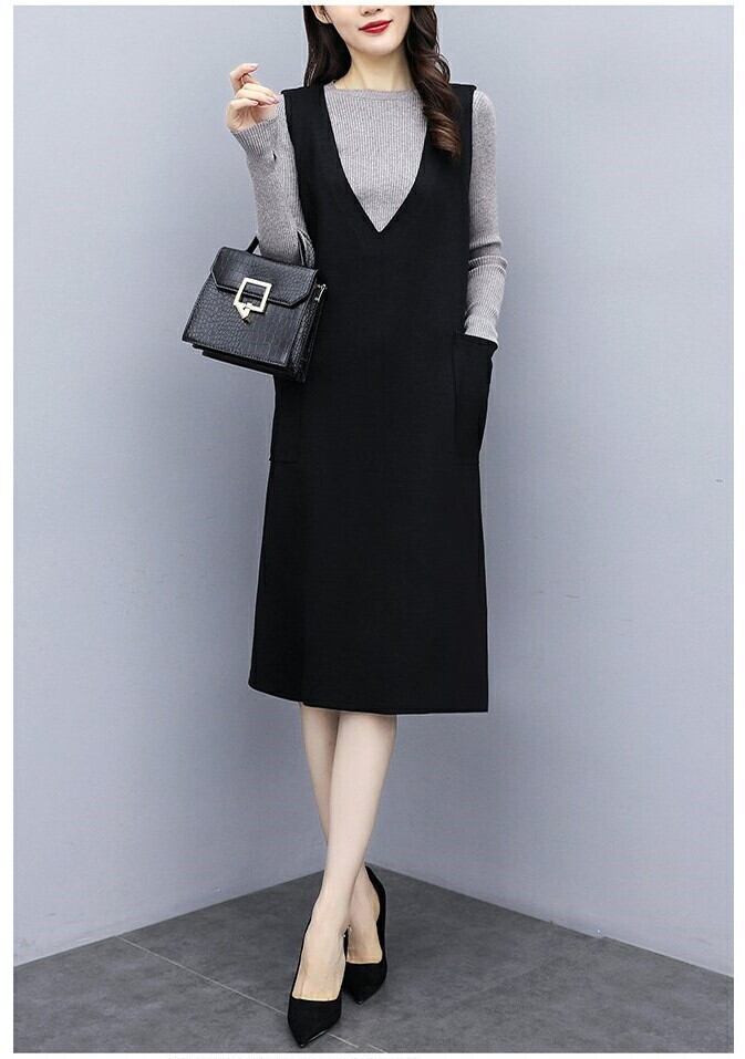 2点セット 大きいサイズ ワンピース ワンピドレス カットソー ジャンパースカート ミドル丈スカート プルオーバー ミドル丈 ラウンドネック 通勤 秋 長袖 ニットソー ブラック 黒 L XL 2XL 3XL トップス スカート セットアップ ミディアム丈 袖なし 袖あり 襟付き ストレート ツーピース かわいい 大人可愛い シンプル 大人 おしゃれ お洒落 大人女子 ラブリー キュート ガーリー エレガント 無地 20代 30代 レディース 女性用 ママ OL お出かけ 休日 ファッション 体系カバー
