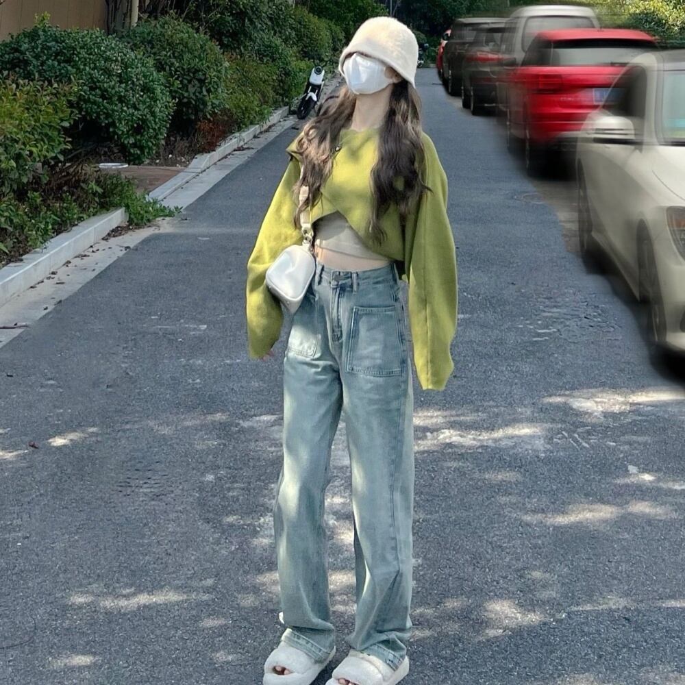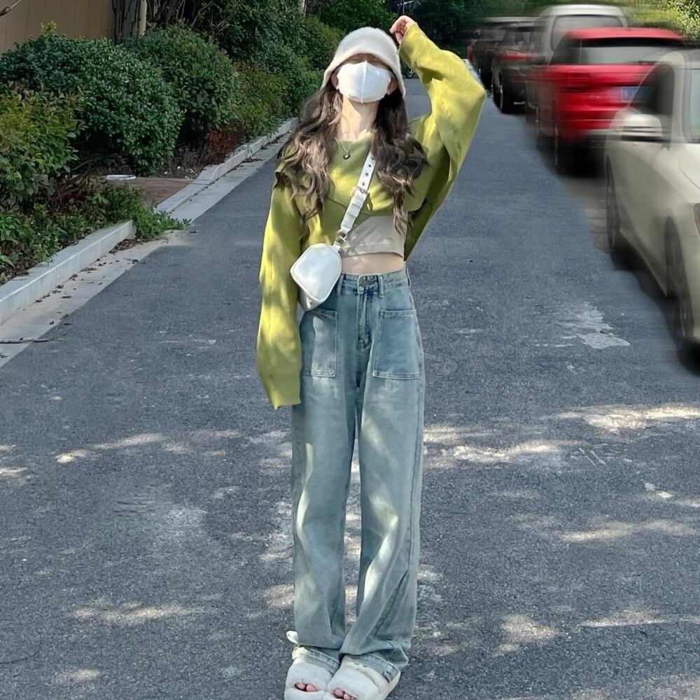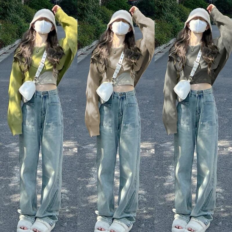 クロップドトップスにワイドデニムを合わせたスタイル映えコーデセット