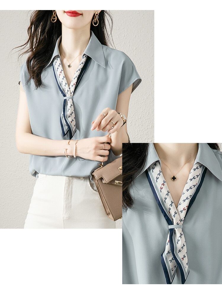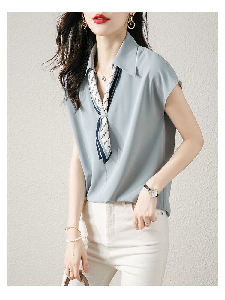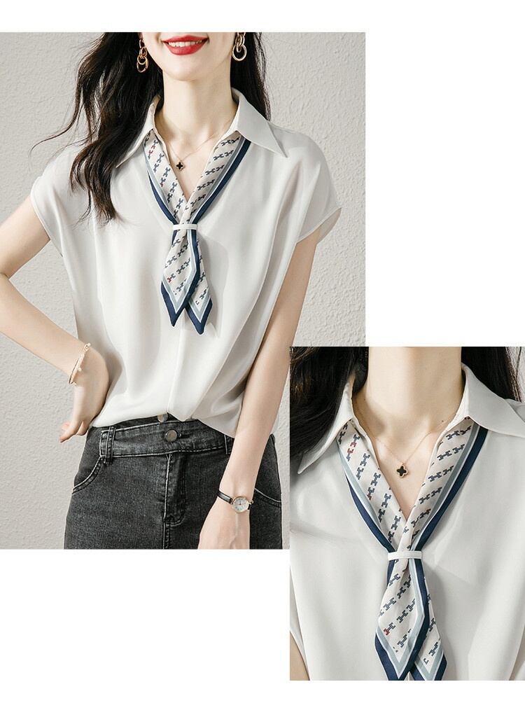 スカーフ付 トップス シャツ ブラウス ショート丈 半端丈 半袖 フレンチスリーブ Vネック 襟付き ストレート 大人可愛い きれいめ シンプル 大人 上品 おしゃれ お洒落 かっこいい スタイリッシュ 大人女子 こなれ感 クール モード系 セクシー エレガント モダン フォーマル とろみ感 S M L XL 白 ホワイト 大人カラー 春カラー ライトブルー 無地 春 夏 レディース ママ オフィス ビジネス OL 通勤 デート お出かけ イベント 着回し 普段使い コーデ スタイル モテ 定番