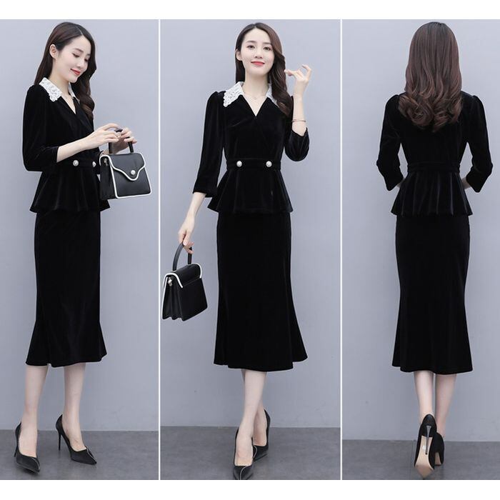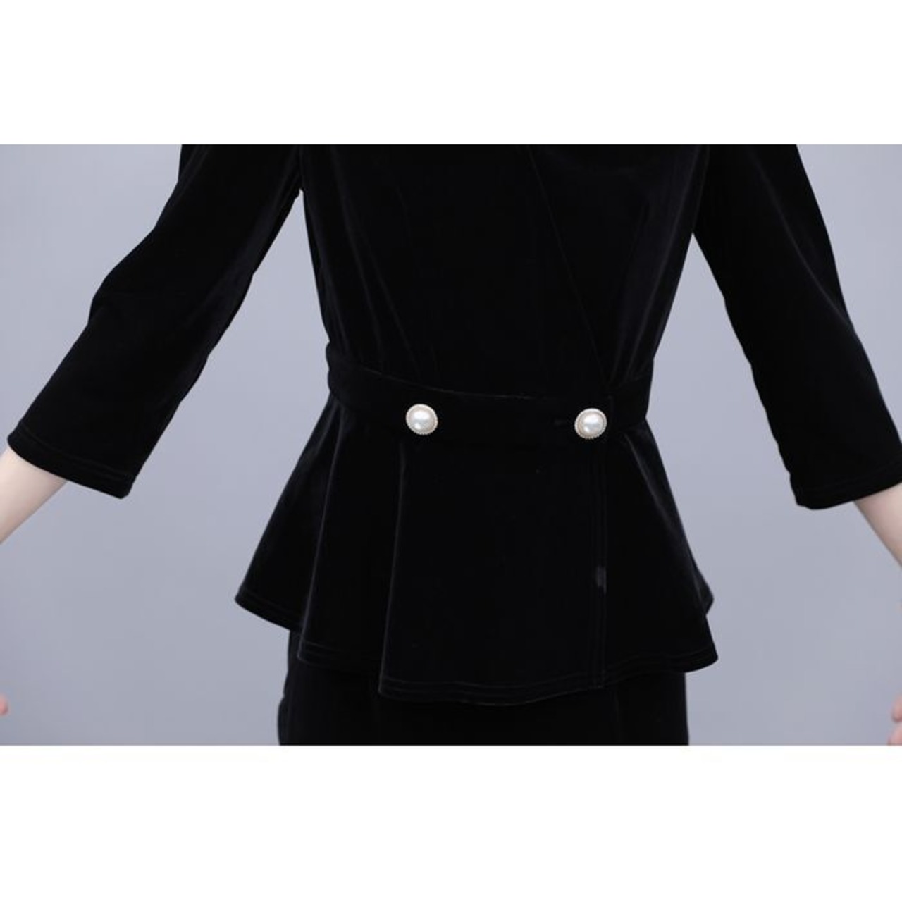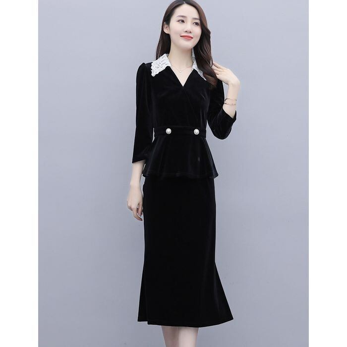 セットアップ ペプラムトップス スカート 膝丈 長袖 襟付き レース襟 ストレート ベルベット 前開き ボタン 上下セット 2点セット ツーピース 大人可愛い きれいめ 大人 上品 おしゃれ お洒落 レトロ 大人女子 モード系 セクシー エレガント モダン フォーマル S M L ブラック 大人カラー 無地 春 秋 冬 卒業式 卒園式 レディース ママ OL 通勤 お出かけ パーティー イベント 着回し 普段使い 重ね着 スタイル 美脚 脚長 定番