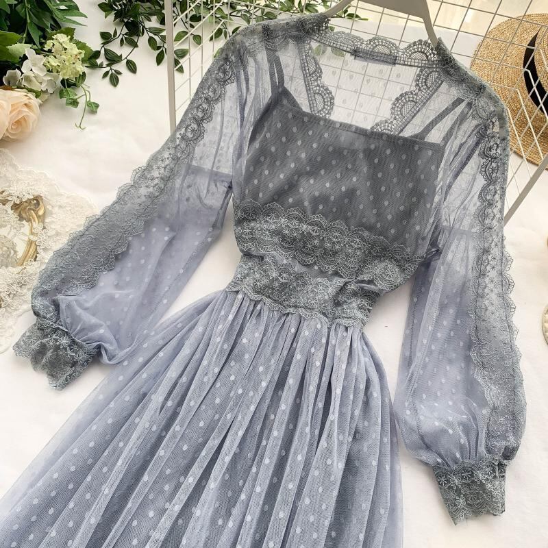 ワンピース チュールスカート フレアワンピース ワンピドレス ミディアム丈 ミドル丈 袖あり 長袖 ボリューム袖 Vネック フレア Aライン レース 刺繍 チュール ウエストマーク 切り替えデザイン ハイウエスト 透け感 可愛い かわいい きれいめ シンプル カジュアル 上品 おしゃれ お洒落 レトロ こなれ感 キュート ガーリー 柄 ドット柄 水玉 春 秋 10代 20代 レディース 女性用 デート お出かけ 女子会 休日 ショッピング 着回し 普段使い ファッション コーデ スタイル 体系カバー モテ