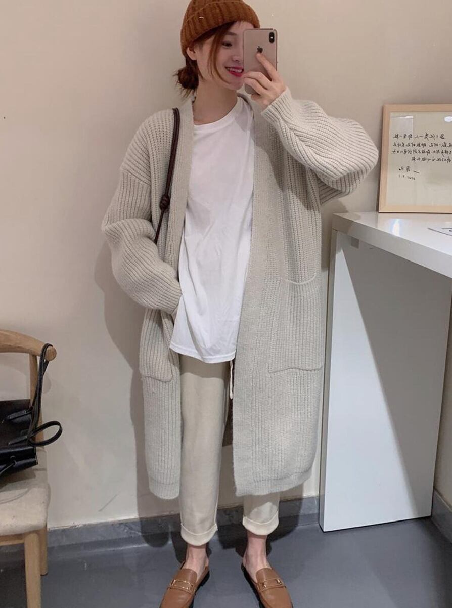 ゆるっと長めな丈感で体型カバーもばっちりなニットカーディガンです。