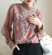 透け感が上品で可愛らしい、シフォンブラウス。フェミニンな印象を与えるバンダナ柄で、大人可愛い雰囲気に。ハイネックのデザインは、首元をすっきりと見せてくれます。