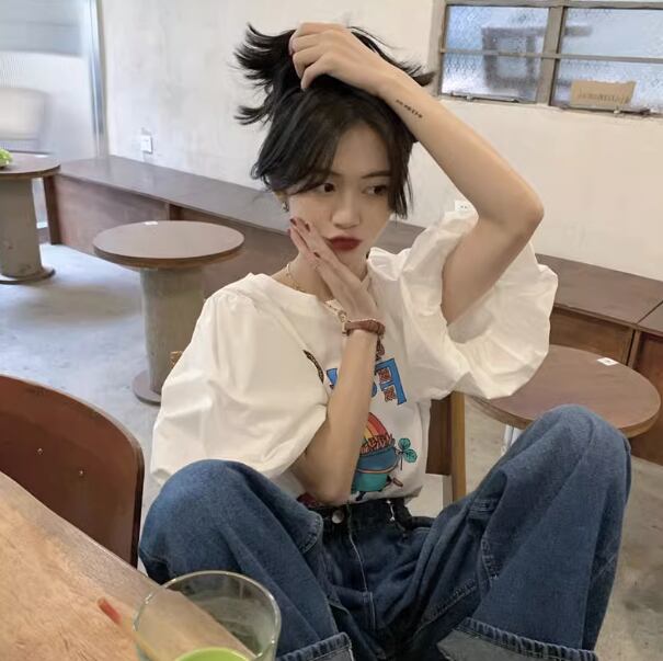 Tシャツでも、袖にパフスリーブがあれば、ぐんと女性らしさがUPします。そんなおしゃれなアイテムを、ヴィンテージ風のキャラクターロゴがアクセントの、こだわり派の方におすすめの一枚です。