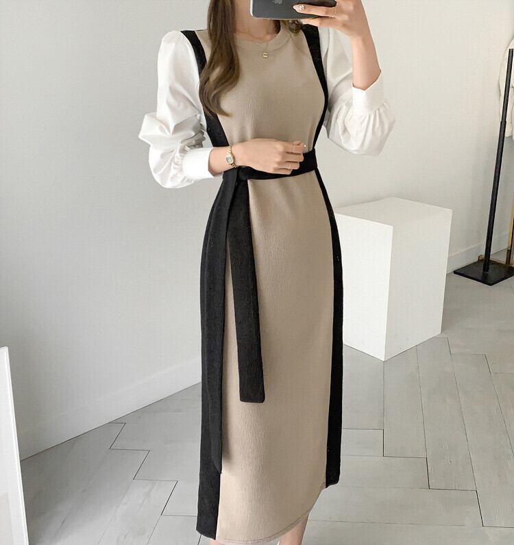 ワンピース タイトワンピース ニットワンピース ウエストリボン ミモレ ミモレ丈 クルーネック 袖あり 長袖 切り替えデザイン ボリューム袖 ブラウス タイト スリム Iライン ドッキング ハイウエスト ウエストマーク ベルト付き リブニット ニット キュート かわいい ガーリー ラブリー 大人可愛い 大人女子 フェミニン エレガント 上品 ロマンチック 抜け感 おしゃれ お洒落 華やか 無地 秋 冬 レディース 女性用 お出かけ デート 女子会 スタイルアップ 脚長 美脚 2色展開 ブラック カーキ