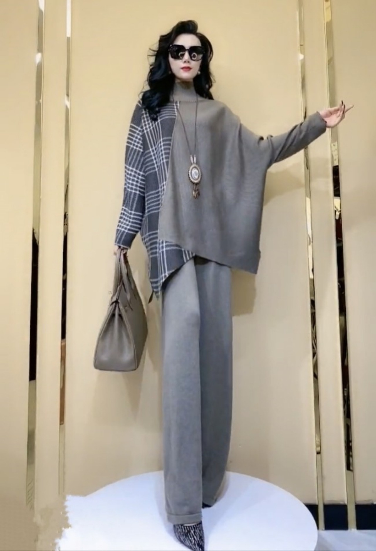 トップス ボトムス セットアップ プルオーバー パンツ ズボン ワイドパンツ ブーツカットパンツ ハイネック 長袖 ドルマンスリーブ バットスリーブ オーバーサイズ 切り替えデザイン 上下セット 2点セット ツーピース キュート かわいい ラブリー 大人可愛い 大人っぽい 大人女子 フェミニン きれいめ エレガント 上品 かっこいい クール ラフ ルーズ モダン おしゃれ お洒落 華やか チェック柄 格子柄 秋 冬 レディース 女性用 普段使い 体系カバー ゆったり 3色展開 ブラック グレー ブラウン