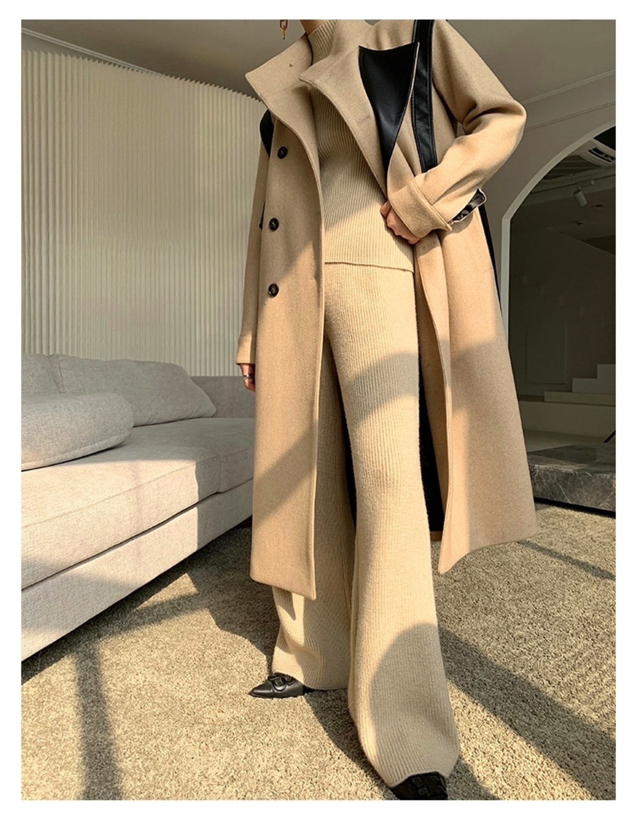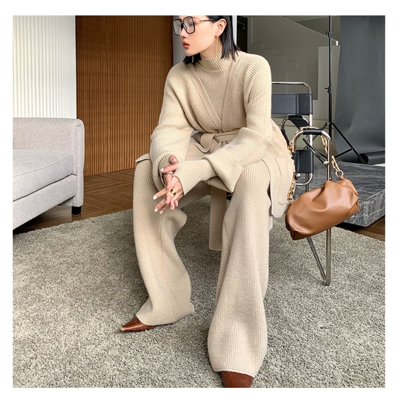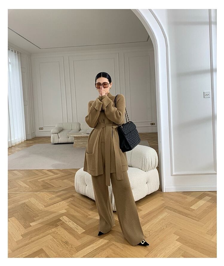 プルオーバーとカーディガン、ワイドパンツの3点セットです。伸縮性のあるリブニットで、快適な着心地です。カーディガンのウエストマークによって、体系カバーとスタイルアップにも期待できます。韓国系のこなれ感あるルックスで、ラフにもエレガントにも着こなせます。