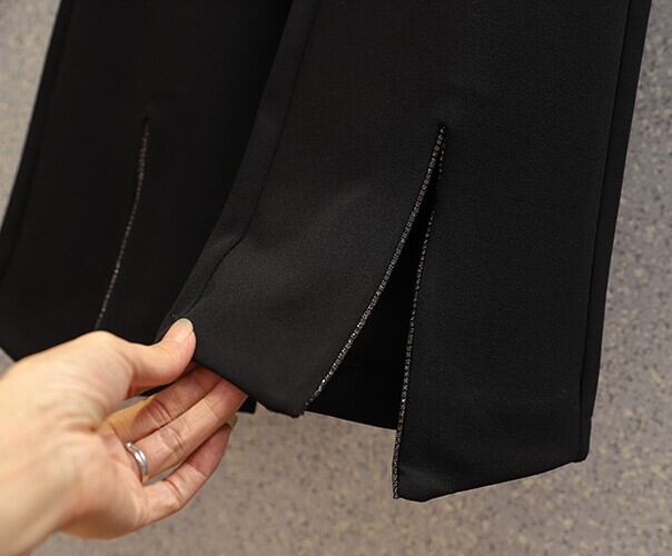 大人可愛い雰囲気が魅力のセットアップ。ボリューム感のあるリボンや立体裁断のデザインがアクセントになり、上品さとおしゃれさを兼ね備えています。白とブラックの無地カラーで、オフィスや通勤にもぴったりです。