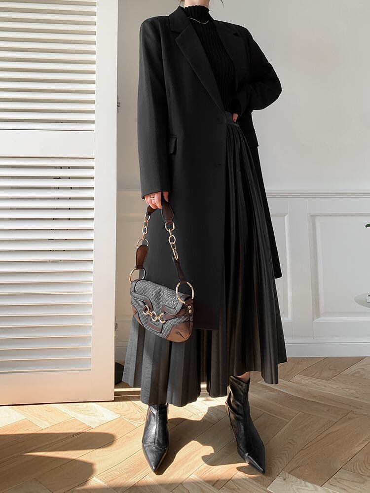 レザースカート ボトムス スカート プリーツスカート ミモレ ミモレ丈 Aライン プリーツ レザー PU かわいい 大人可愛い きれいめ 大人 上品 おしゃれ お洒落 かっこいい スタイリッシュ 大人女子 こなれ感 ガーリー 個性的 クール モード系 エレガント モダン 主役級 存在感 S M L 黒 ブラック 大人カラー モノトーン 無地 秋 冬 レディース OL 通勤 デート お出かけ パーティー イベント 韓国 韓国系 オルチャン ファッション コーデ スタイル インスタ映え 甘辛ミックス