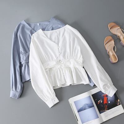 トップス シフォンシャツ Vネック シャツ デザイン ボタン 秋 春 シフォンブラウス ブラウス 袖あり 長袖 ボリューム袖 パフスリーブ ワイド フリル 切り替えデザイン ふわふわ リブ 伸縮性 かわいい 大人可愛い きれいめ カジュアル 大人 おしゃれ 大人女子 こなれ感 キュート ガーリー ルーズ 存在感 抜け感 無地 10代 20代 レディース 女性用 女の子 オフィス OL デート お出かけ イベント リゾート ファッション コーデ スタイル モテ ホワイト ブルー S M L 2色展開