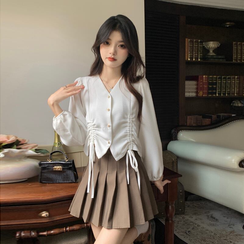 「クラシカルな雰囲気と遊び心を兼ね備えたVネックブラウス。ドローコードで自由自在にシャーリングができるので、その日の気分やシーンに合わせて変化を楽しめます。ボリュームのあるスリーブと、パールがあしらわれたボタンで、エレガントな印象を与えます。美しいラインを作りだすボディシルエットで、女性らしい雰囲気を演出します。