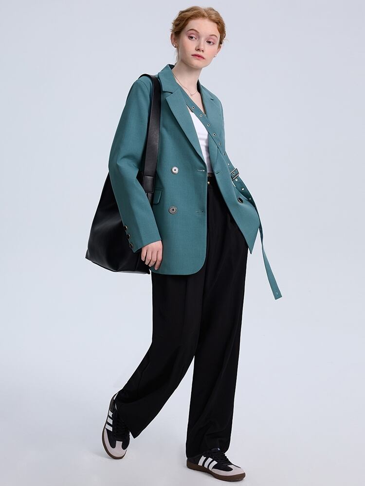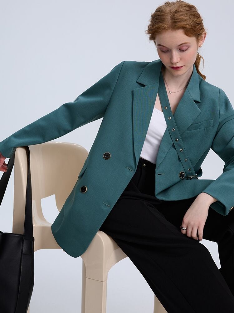 斜めにあしらわれたベルトがポイントのブレザージャケットです。