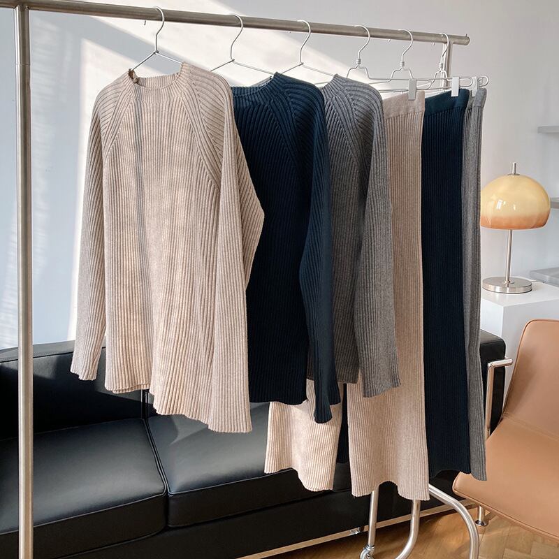 リブニット トップス パンツ セットアップ セーター プルオーバー ミディアム丈 長袖 モックネック 襟なし サイドスリット ボトムス ワイドパンツ ロング丈 ニット 上下セット 2点セット ツーピース シンプル カジュアル 大人 おしゃれ お洒落 こなれ感 リラクシー 無地 春 秋 レディース 女性用 ママ 女の子 お出かけ 女子会 休日 旅行 着回し 普段使い デイリー 韓国系 オルチャン ファッション コーデ スタイル 楽ちん 体系カバー S M L XL ゆったり ブルー キャメル 大人カラー