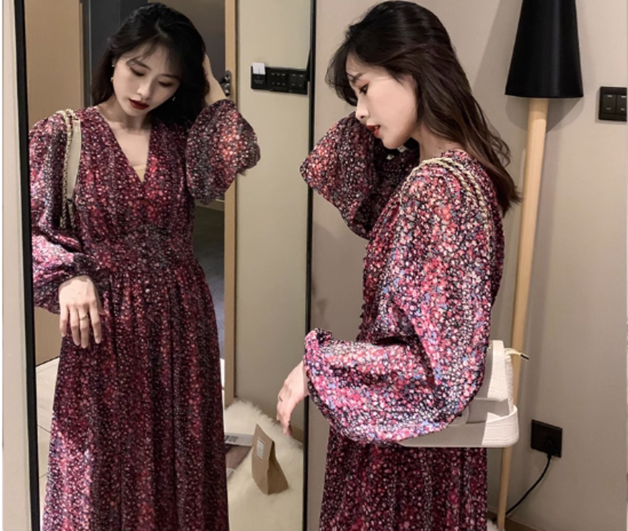 美しく揺れるドレープが魅力の、小花柄のワンピースです。ヘンリーネックのデザインで、上品な印象もプラス。長袖なので、アウターを羽織れば秋冬のコーディネートにもぴったりです。ウエスト部分には、華奢に見せるウエストマークが入っています。フレアなシルエットで、歩くたびに揺れるヒップラインが女性らしさを引き出します。