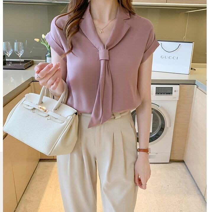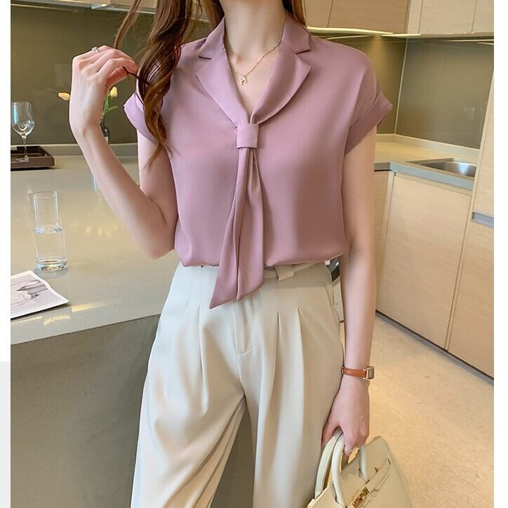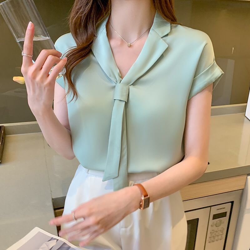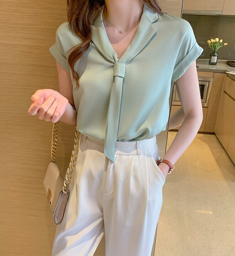 ボウタイドッキング トップス ブラウス ミディアム丈 半袖 フレンチスリーブ 襟付き オープンカラー 開襟 Vネック かわいい 大人可愛い きれいめ シンプル 上品 おしゃれ お洒落 エレガント きちんと感 涼しげ 無地 春 夏 レディース 女性用 ママ 女の子 オフィス OL 通勤 学生 通学 お出かけ お呼ばれ 休日 着回し 重ね着 普段使い 韓国系 オルチャン ファッション コーデ スタイル 体系カバー S M L XL 2XL 大きいサイズ ゆったり 白 ホワイト 緑 グリーン ピンク カラバリ