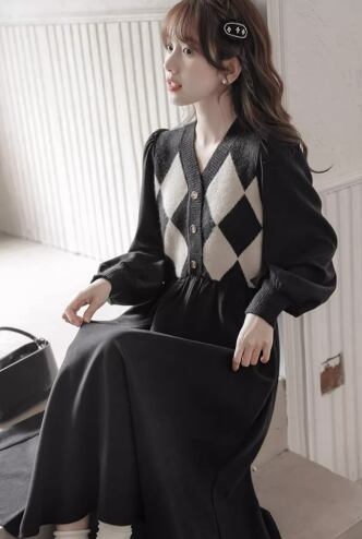 ワンピース 膝下 長袖 Vネック フレア ドッキング デザイン ボタン 美ライン ニュアンス レイヤード 伸縮性 ニット かわいい 大人可愛い きれいめ シンプル カジュアル 大人 上品 おしゃれ お洒落 大人可愛い 大人女子 こなれ感 ラブリー キュート ガーリー 個性的 エレガント モダン 主役級 存在感 抜け感 ベーシック ヨーロッパカジュアル ブリティッシュ スタンダード 洗練 アーガイル エイジレス レディース お出かけ 旅行 着回し 普段使い 重ね着 お揃い 双子 ファッション
