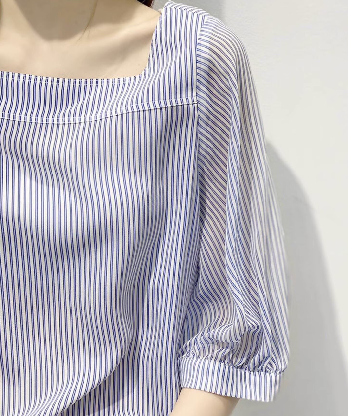 トップス シャツ ブラウス ミディアム丈 ミドル丈 袖あり 5分袖 五分袖 ボリューム袖 パフスリーブ スクエアネック ストレート プルオーバー ポリエステル かわいい きれいめ シンプル カジュアル 大人 上品 おしゃれ お洒落 大人可愛い 大人女子 こなれ感 ガーリー フォーマル 柄 ボーダー ストライプ 春 夏 20代 30代 レディース 女性用 ママ オフィス ビジネス OL 通勤 学生 通学 お出かけ 休日 ショッピング 着回し 普段使い ファッション コーデ スタイル モテ 体系カバー