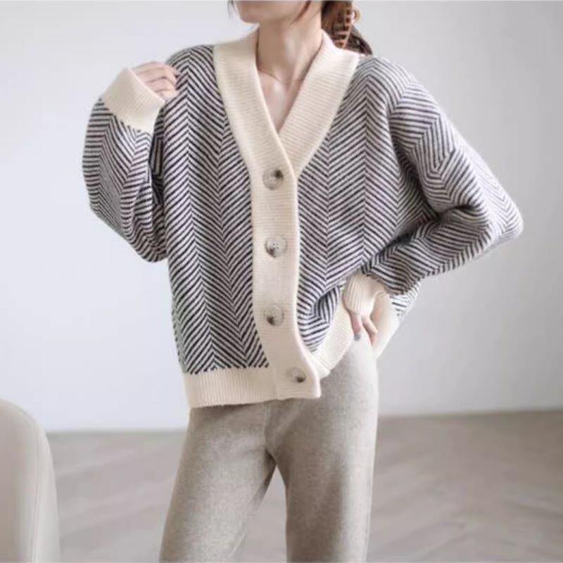 シェブロンストライプ柄のオーバーサイズカーディガン。大きめのボタンがアクセントになったシンプルな中にレトロ感のあるデザインです。ドロップショルダーのゆったりシルエットで自然に体型カバーしながらカジュアルなこなれ感をプラスできます。