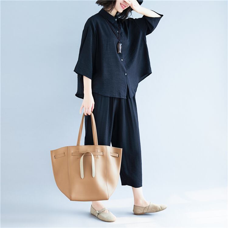 2点セット トップス ブラウス ボトムス セットアップ プルオーバー シャツ 七分袖 ドロップショルダー Vネック 襟あり シャツカラー パンツ ジョガーパンツ リラックス ポケット 上下セット イージーパンツ シンプル カジュアル おしゃれ かっこいい こなれ感 スポーティー 無地 春 秋 レディース 女性用 ママ 女の子 お出かけ 休日 運動 着回し 普段使い 部屋着 韓国系 オルチャン ファッション スタイル 体系カバー フリーサイズ ワンサイズ 大きいサイズ 黒 ブラック ネイビー モノトーン