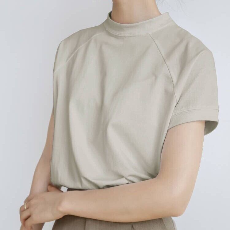 モダンスタイルが魅力のシンプルTシャツ。ハーフハイカラーがおしゃれをワンランクアップさせます。体型をカバーしながら、スタイリッシュに着こなせる1着です。