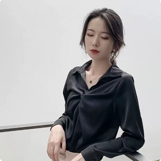 ネック下をねじったツイストデザインがおしゃれな長袖ブラウス。ネックレス等首元のおしゃれが映える襟付きのスキッパーデザインが女らしく、大人っぽく上品に決まります。