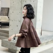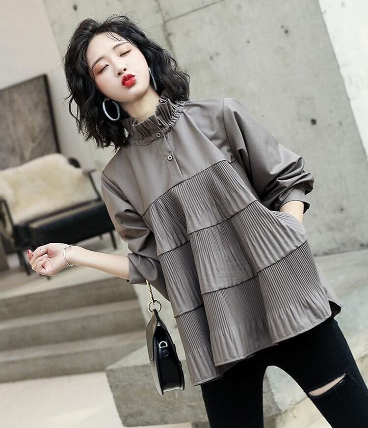 消しプリーツ切替え 裾広がり ティアード トップス ブラウス ミディアム丈 Aライン 長袖 ランタンスリーブ ボリューム袖 襟付き スタンドカラー ハイネック バックネックリボン バックシャン バックコンシャス 切り替えデザイン かわいい 大人可愛い シンプル カジュアル きれいめ 上品 おしゃれ キュート 無地 春 秋 レディース ママ マタニティ 女の子 OL 通勤 学生 通学 デート お出かけ 休日 普段使い 韓国系 体系カバー S M L XL ゆったり 灰色 グレー 茶色 ブラウン カラバリ