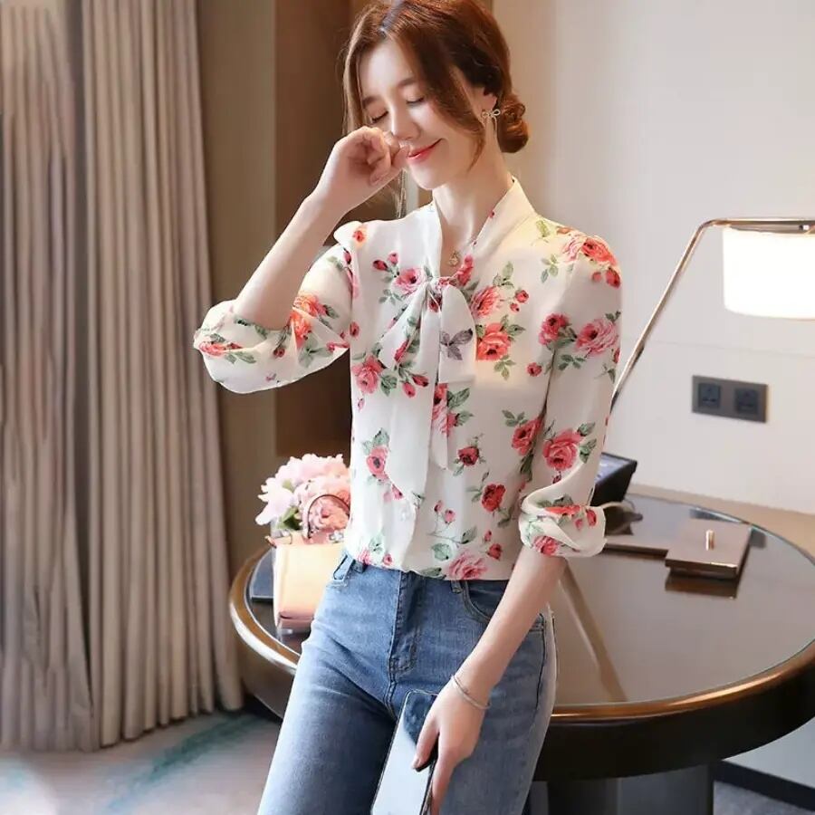 キュートでエレガントな印象のトップスに、華やかなリボンがポイントの一枚。透け感のあるシフォン素材が女性らしさを引き立て、花柄のプリントがさらに季節感と華やかさを添えます。Vネックでデコルテを美しく魅せ、抜け感のある着こなしも楽しめます。オフィススタイルからお出かけまで幅広く活躍するアイテムで、洗練された大人可愛い雰囲気を演出できるでしょう。