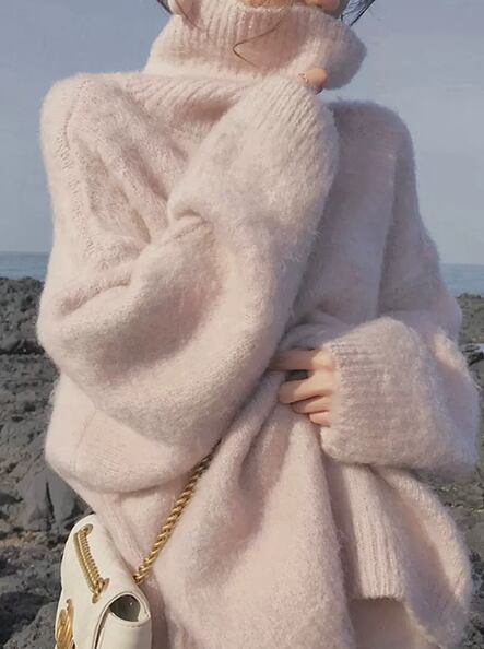 このトップスは、毛足の長いふわふわニット素材で、ふんわりと可愛い印象を与えます。デザインはドルマンスリーブとオーバーサイズで、美しいラインが出るようになっています。さらに、キュートなタートルネックデザインが、上品かつロマンチックな雰囲気を醸し出します。