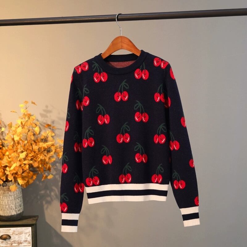 トップス セーター プルオーバー ラウンドネック 長袖 伸縮性 ニット キュート かわいい ガーリー ラブリー カジュアル レトロ 抜け感 おしゃれ お洒落 華やか 主役級 存在感 個性的 チェリー サクランボ さくらんぼ ライン ボーダー 秋 冬 10代 20代 30代 レディース 女性用 お出かけ デート 女子会 普段使い 楽ちん オルチャン 韓国系 モテ 動きやすい フリーサイズ 2色展開 灰色 グレー 紺色 ネイビー