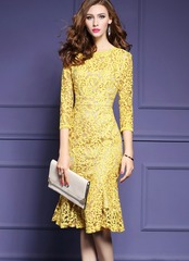 ワンピース ワンピドレス 膝下 ミディアム丈 ミドル丈 袖あり 5分袖 五分袖 7分袖 七分袖 ラウンドネック スリム タイト 細身 レース 刺繍 ハイウエスト 透け感 シースルー かわいい 綺麗め きれいめ シンプル 大人 上品 おしゃれ お洒落 レトロ 大人可愛い 大人女子 こなれ感 セクシー エレガント フォーマル 柄 花柄 小花柄 フラワー 春 夏 秋 20代 30代 レディース 女性用 お出かけ 休日 パーティー イベント レストラン ショッピング 着回し 普段使い ファッション 黄色 イエロー