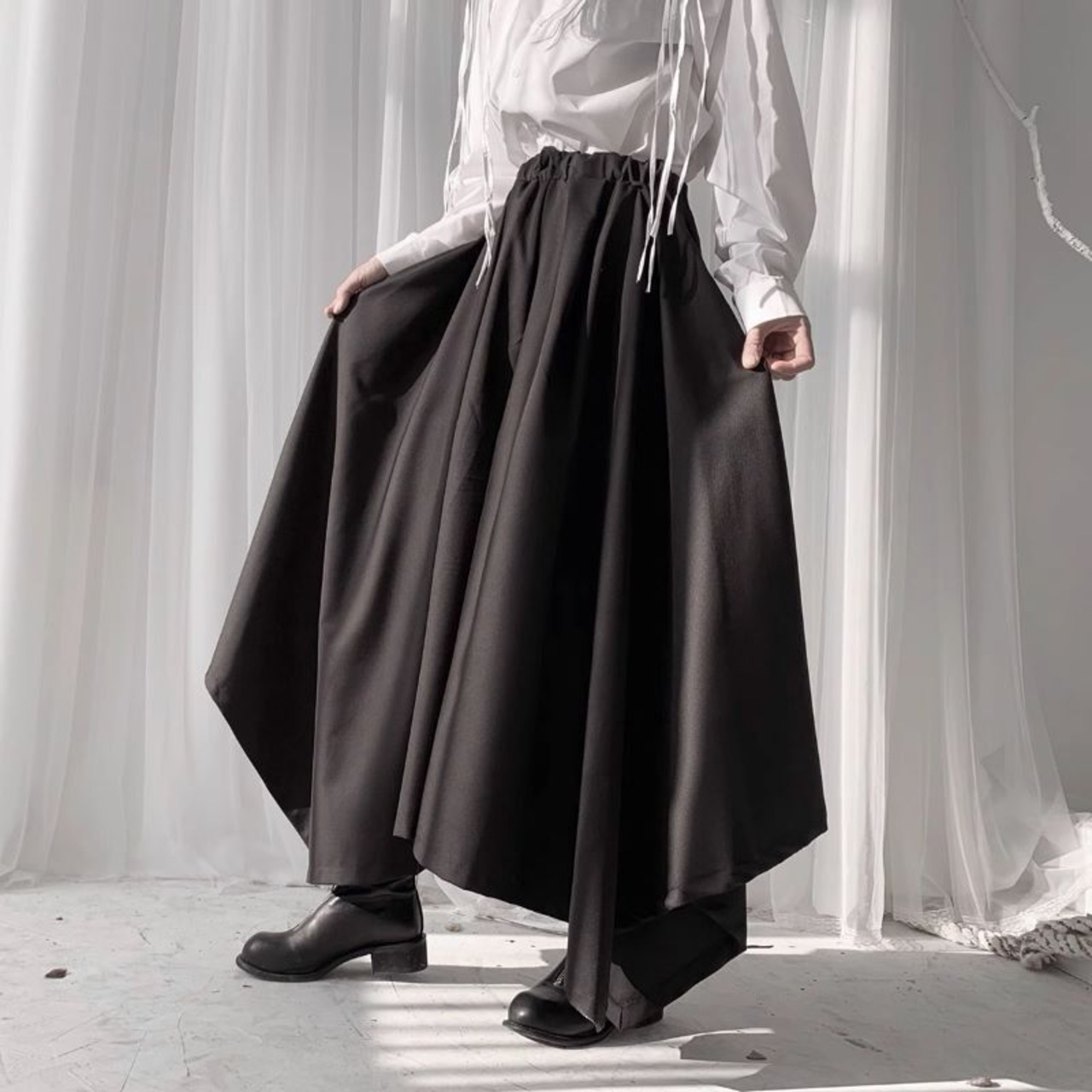 大人っぽくモードな雰囲気がかっこいいハンカチヘムのワイドレッグパンツ。不規則なジグザグカットの裾デザインがポイントで生地をたっぷり使ったスカート風のデザインです。