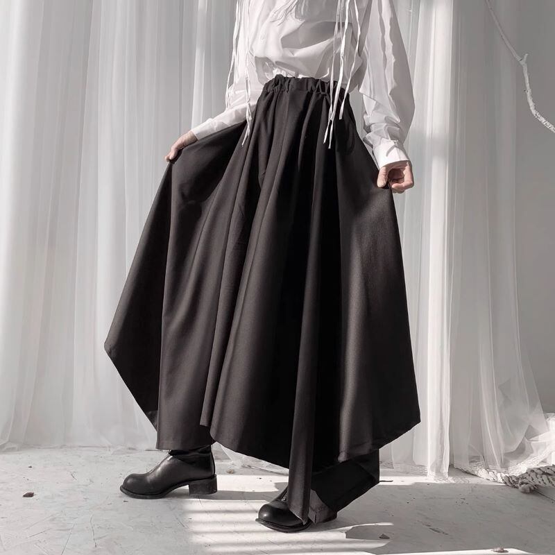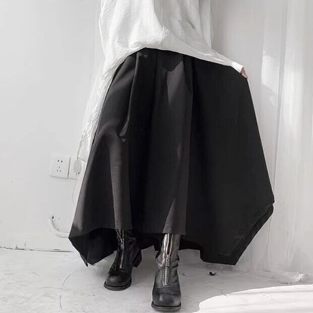 ハンカチヘム ワイドレッグパンツ スカンツ ボトムス パンツ ズボン ワイドパンツ 膝下 ミモレ ロング丈 Aライン ウエストゴム シンプル カジュアル 大人 上品 おしゃれ お洒落 かっこいい こなれ感 ルーズ 個性的 クール モード系 無地 春 夏 秋 冬 シーズンレス レディース ママ 女の子 学生 通学 デート お出かけ 女子会 休日 着回し 普段使い 韓国系 オルチャン ファッション コーデ スタイル 楽ちん 体系カバー S M L XL 2XL 大きいサイズ ゆったり 黒 ブラック モノトーン