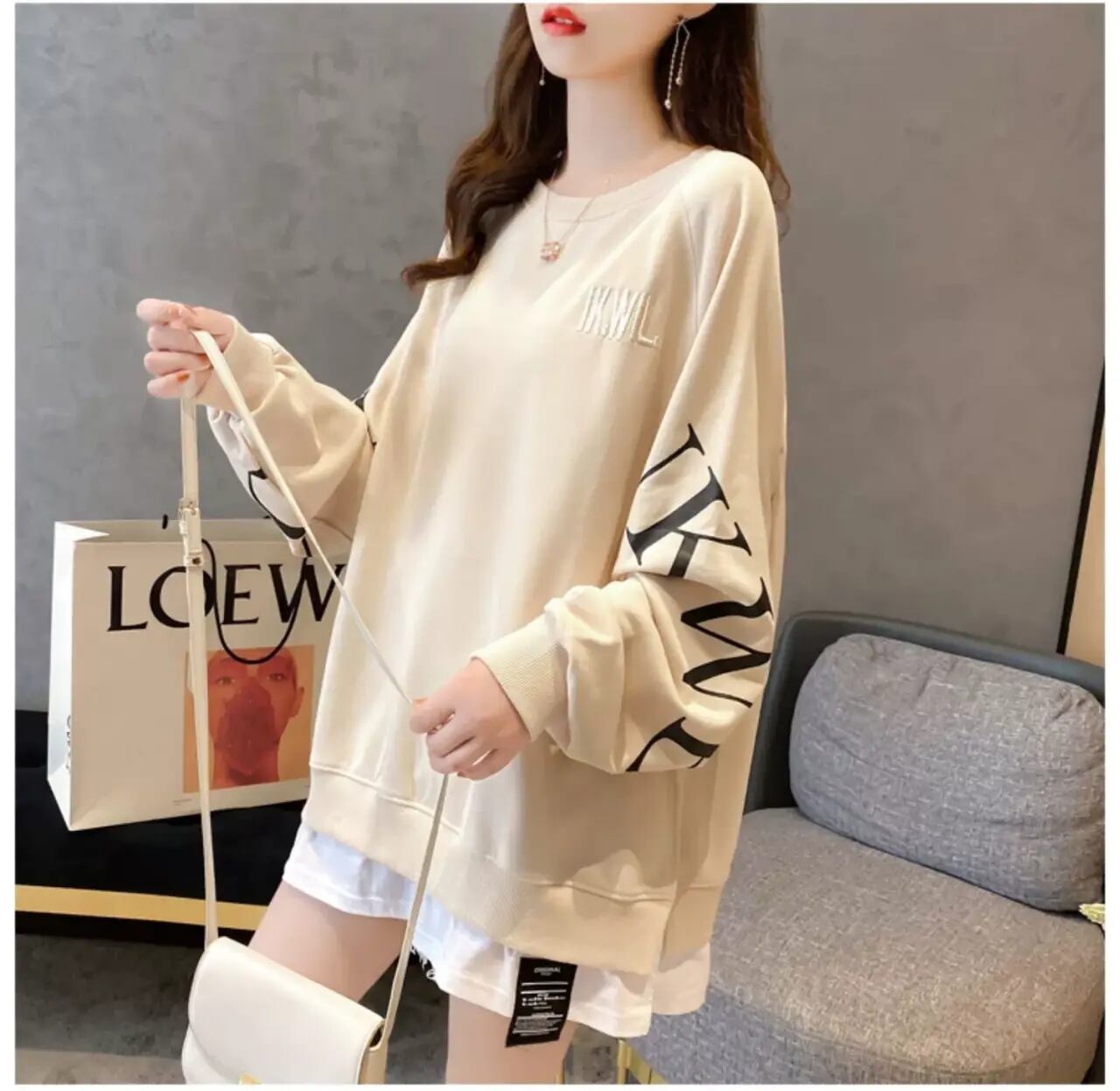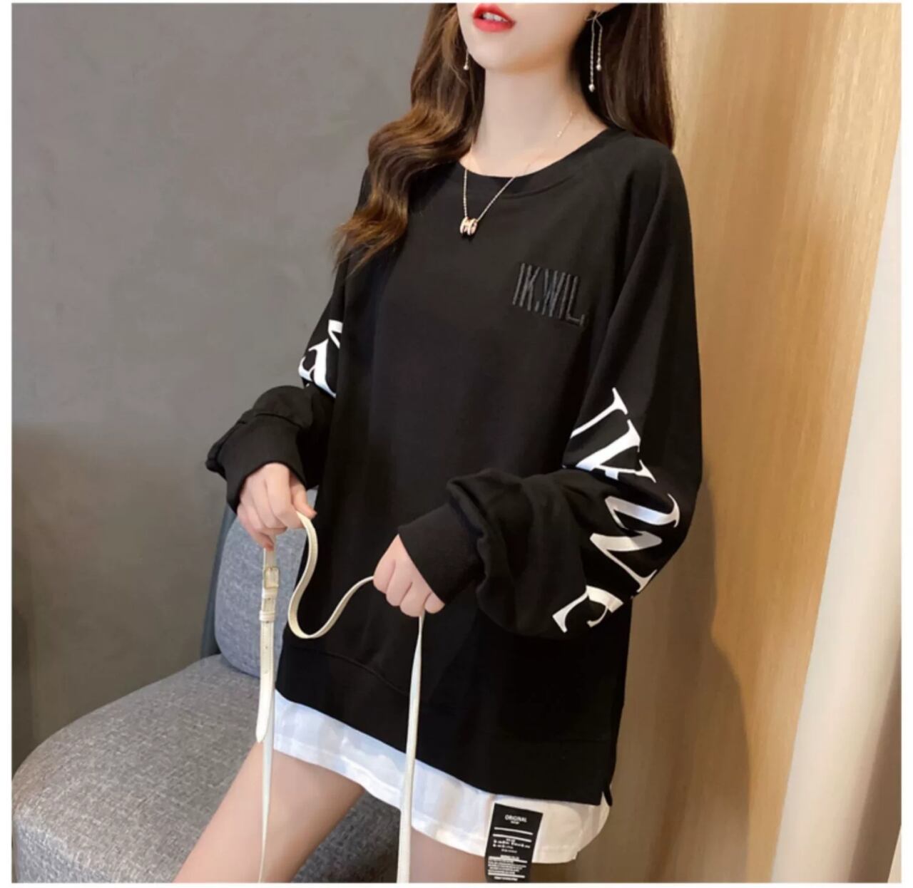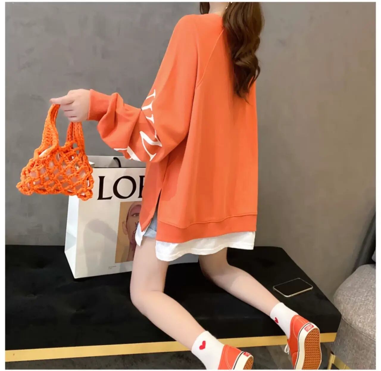トップス スウェット ラウンドネック 長袖 ボリューム袖 ビッグシルエット オーバーサイズ 刺繍 フェイクレイヤード 厚手 キュート かわいい 上品 かっこいい メンズライク マニッシュ ボーイッシュ ストリート カジュアル こなれ感 ラフ ルーズ 抜け感 おしゃれ お洒落 存在感 個性的 プリント ロゴ 秋 冬 レディース 女性用 普段使い デイリー 楽ちん 体系カバー 動きやすい 暖かい 防寒 M L XL 2XL ゆったり ゆる 4色展開 アプリコット 黒 ブラック 青 ブルー オレンジ