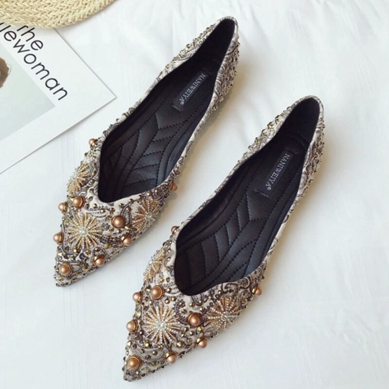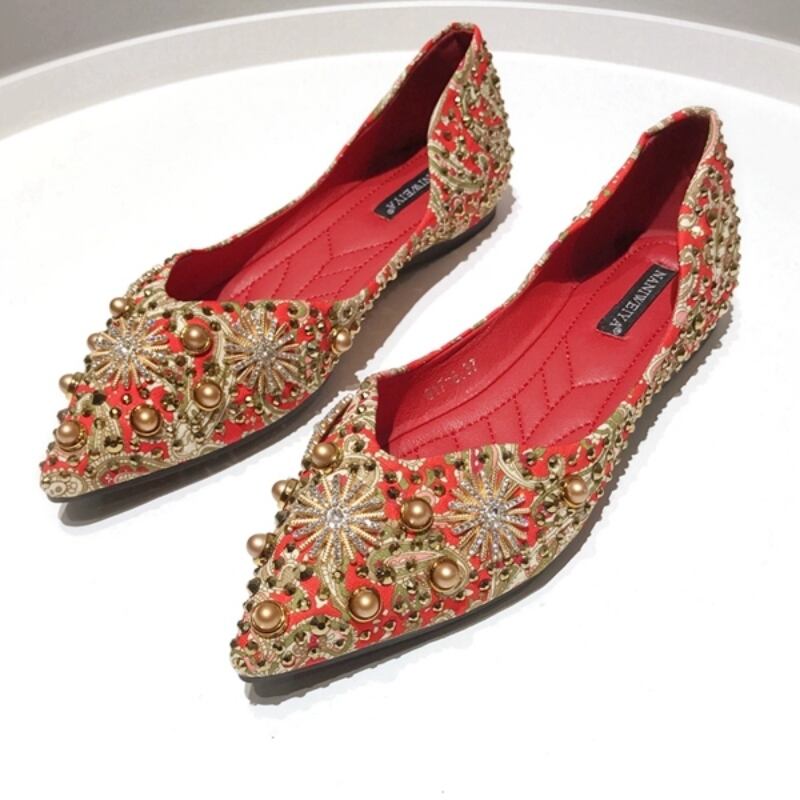 シューズ 靴 くつ クツ パンプス レディースシューズ レディースパンプス ヒール ローヒール フラット ぺたんこ ペタンコ 2cmヒール ポインテッドトゥ 歩きやすい 走れる 疲れにくい ビジュー キラキラ かわいい 大人可愛い カジュアル 大人 上品 おしゃれ お洒落 エレガント 大人っぽい 女っぽ ラフ ルーズ 個性的 主役級 存在感 アジアン エスニック エキゾチック 春 夏 秋 20代 30代 40代 レディース 女性用 お出かけ デイリー 普段使い 3色展開 ブラック レッド アプリコット