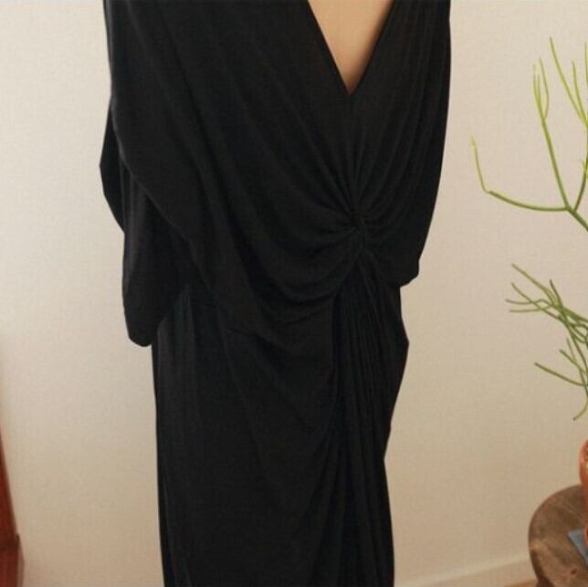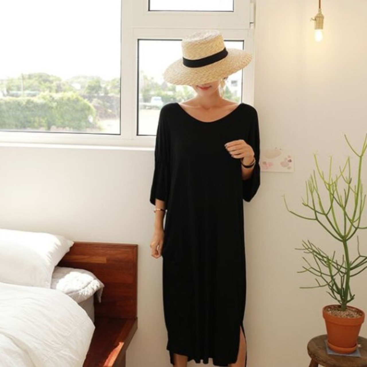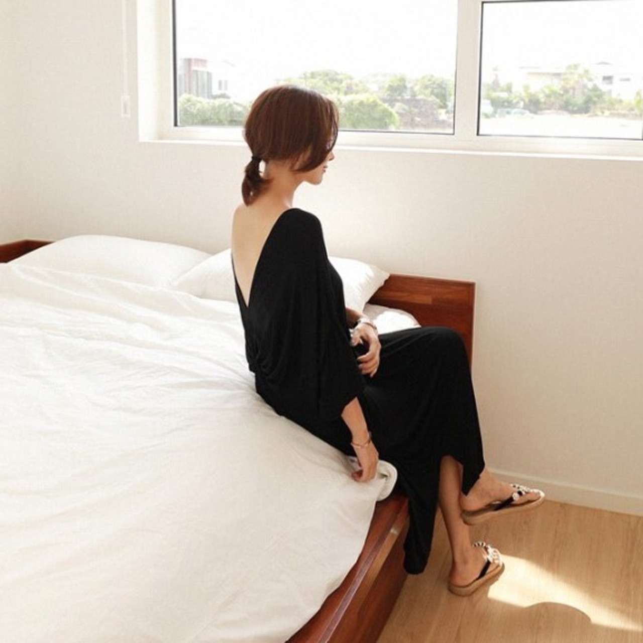 オーバーサイズ バックVネック 背中見せ ワンピース サマードレス ミモレ丈 ミディアム丈 七分袖 トランペットスリーブ ベルスリーブ 襟なし ワイドVネック Iライン バックシャン バックコンシャス サイドスリット シンプル カジュアル きれいめ 上品 大人っぽい おしゃれ こなれ感 セクシー 女っぽ リラクシー 無地 春 夏 レディース 女の子 デート お出かけ 女子会 リゾート 旅行 休日 普段使い 韓国系 オルチャン ファッション スタイル 体系カバー S M L XL ゆったり 黒 ブラック