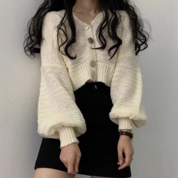 スタイリッシュで個性的なショート丈のニットカーディガンです。ボタンのデザインや編み柄の組み合わせがユニークで、おしゃれ感を際立たせます。身体を華奢に見せるVネックとボリュームスリーブの組み合わせが美ラインを演出し、上品な印象を与えます。