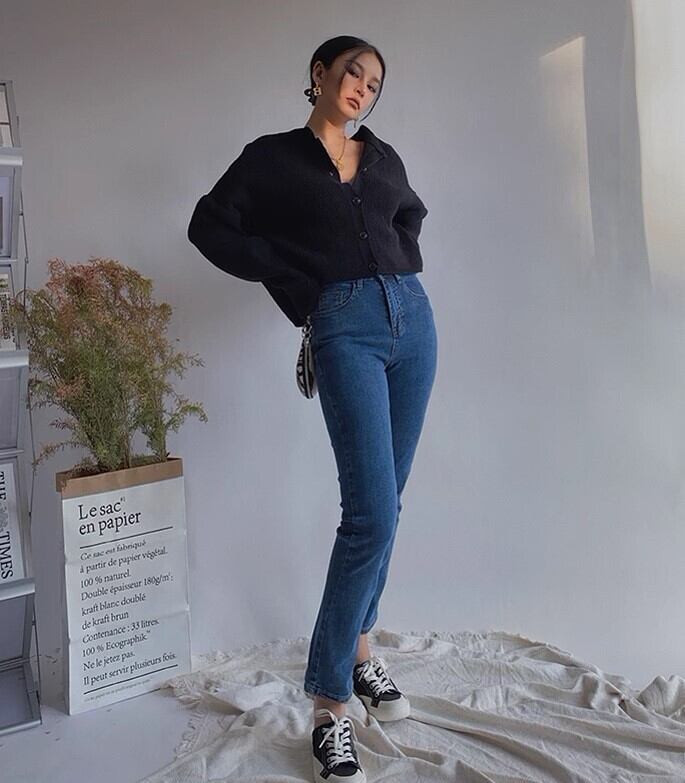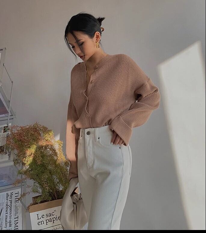 前ボタンを開ける数で肌見せ感を調節でき、羽織りものとしてもニットトップスとしても着回し自在。普段使いのカジュアルスタイル~女っぽさのあるきれいめスタイルまで対応でき、合わせるボトムを選ばず着こなしやすいのも魅力です。