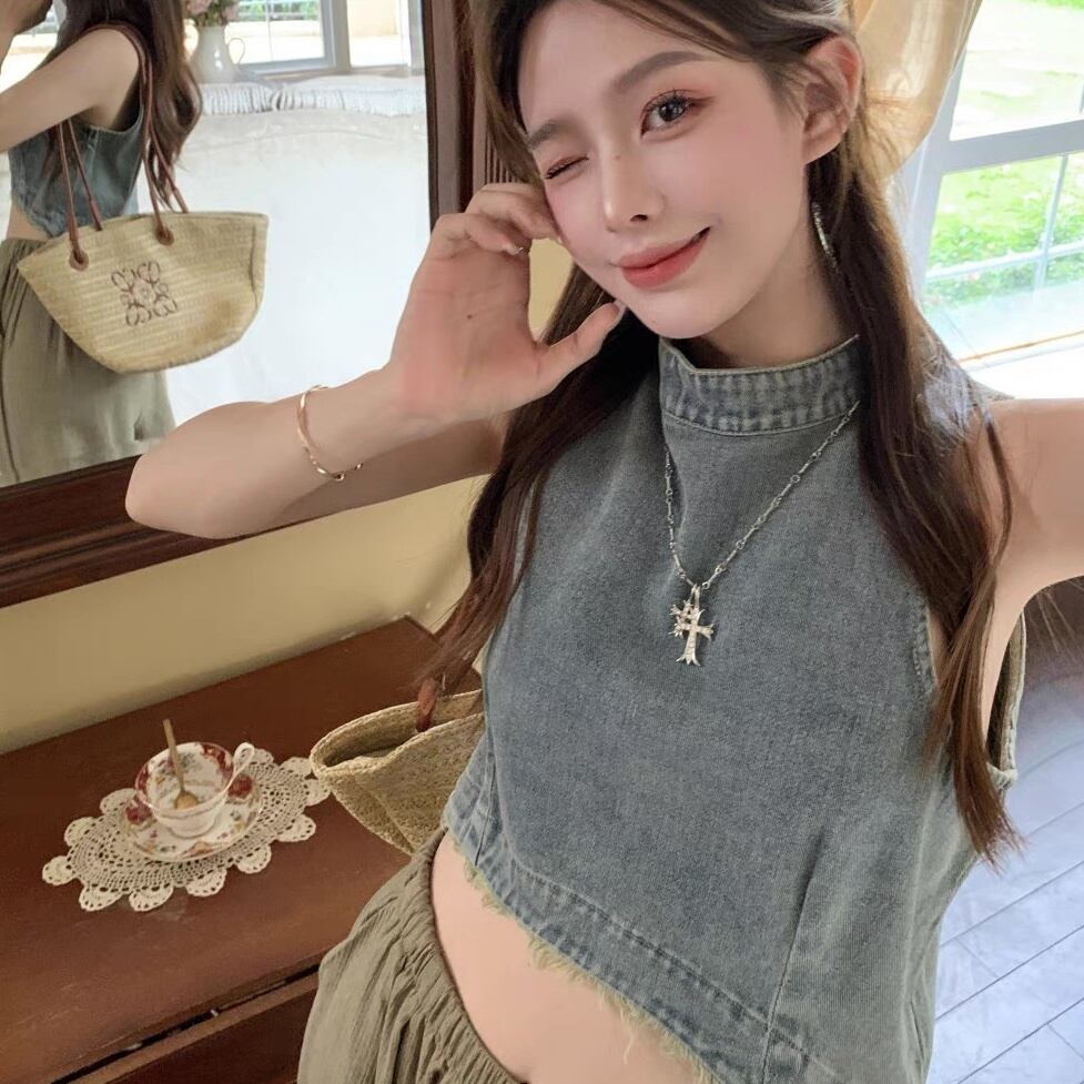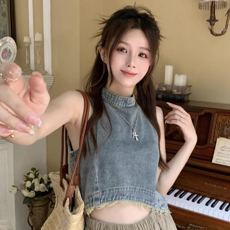 レディース トップス キャミソール タンクトップ ショート 袖なし ノースリーブ スタンドカラー フェミニン ストリート ダメージ デニム ブルーデニム かわいい 大人可愛い シンプル カジュアル おしゃれ かっこいい こなれ感 ラフ ガーリー ルーズ クール 抜け感 ベーシック アメリカン プレッピー カントリー アクティブ ナチュラル 無地 夏 お出かけ イベント 女子会 休日 コンサート ライブ 重ね着 コーデ 楽ちん 普段使い 着回し レイヤード トレンド 流行 インスタ映え S M L ブルー