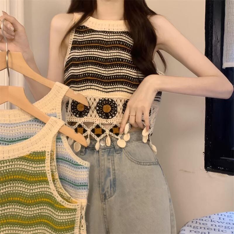 夏のデートやお出かけにぴったりな、レトロでガーリーな雰囲気漂うキャミソール。クロシェ編み込みが女性らしい可愛さを引き立てます。S、M、Lのサイズ展開で、ブラックや水色、緑といった鮮やかなカラーバリエーションも揃っています。普段使いからリゾートや旅行、女子会まで、さまざまなシーンで活躍する一着です。