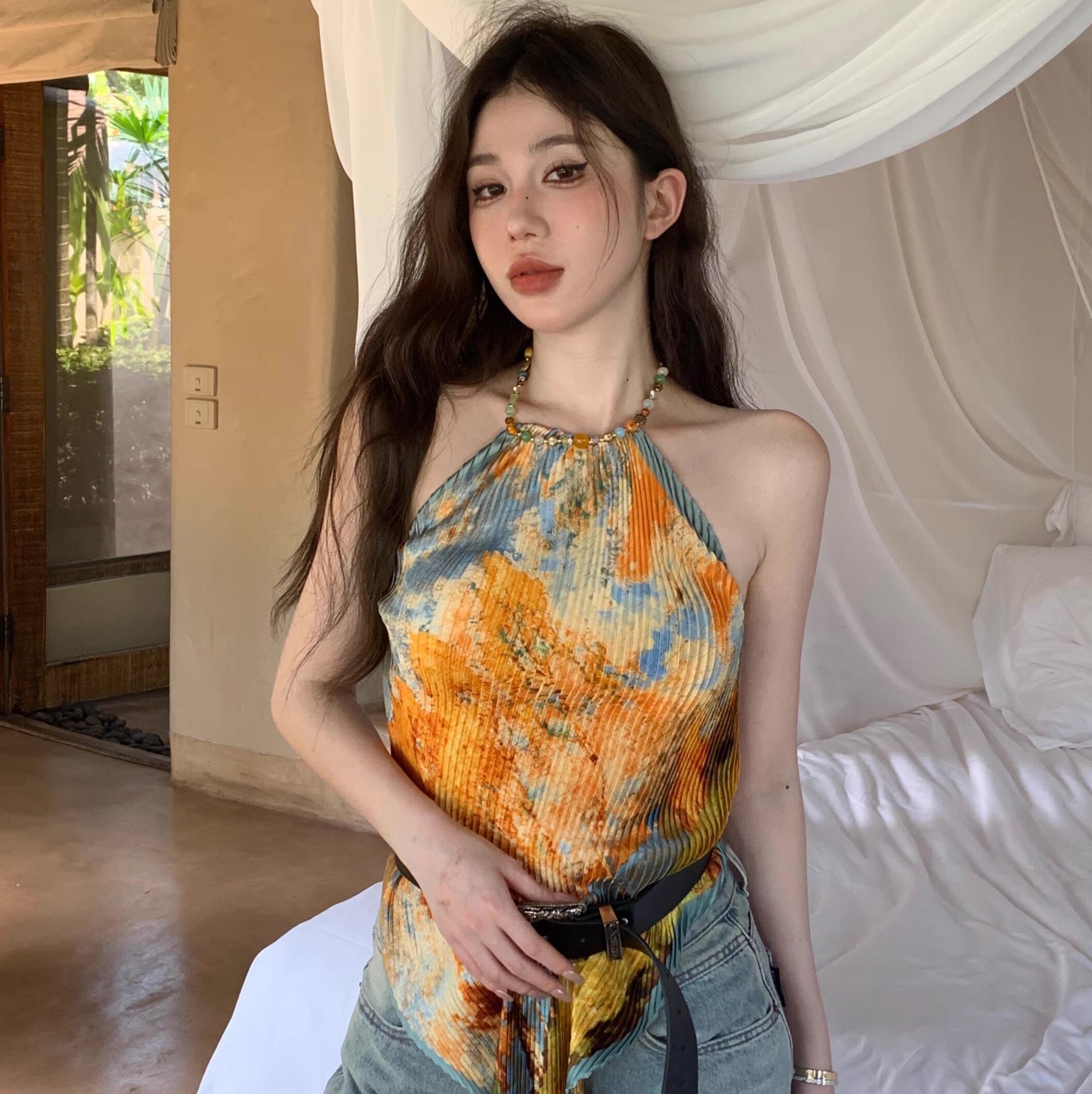 異国風の魅力あふれるキャミソール。背中開きのホルターネックデザインがセクシーさを引き立て、ヴィンテージな雰囲気を漂わせます。プリーツとビーズストラップが華やかさをプラスし、存在感抜群の主役級アイテム。夏のイベントやビーチパーティーに最適な、大人可愛い一着です。